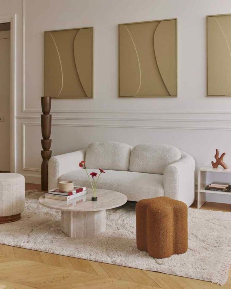 C'est un style de design qui privilégie des lignes épurées, des matériaux naturels et des couleurs neutres. Beaucoup de bois, de tissus naturels et une palette de tons doux comme le beige, le blanc le gris. On aime apporter aussi la touche de noir que ce soit pour le petit mobilier ou les luminaires. Tous les éléments ont une fonction et une place bien définie, rien n'est laissé au hasard. Pour les canapés et fauteuils, on les aime encore et toujours avec leur forme organique. Les meubles se distinguent par leurs lignes basses et leur sobriété. On veut de la sérénité, de l'équilibre et de l'élégance et c'est réussi.